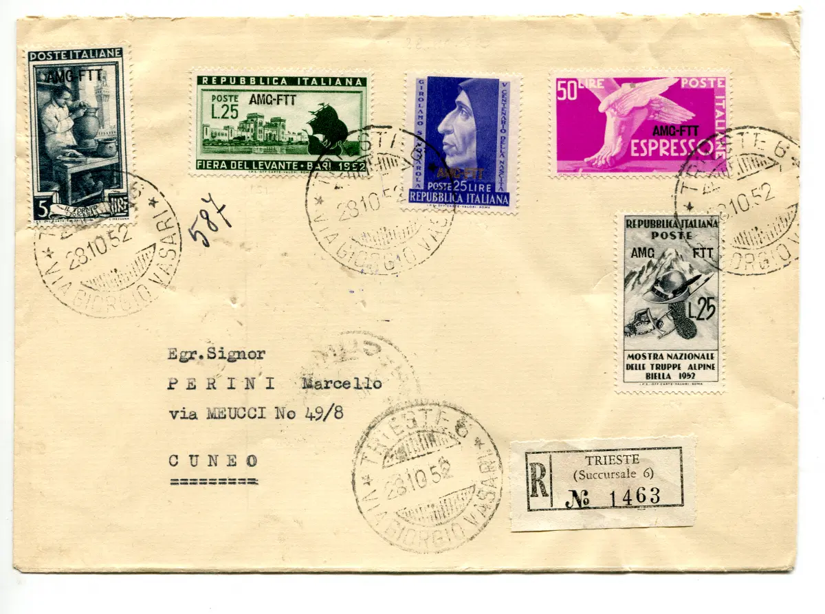 Umschlag - Triest A - Bari ' 52 Nr. 153 + Ergänzungen Nr. 92 + 154 + 156 + Espresso Nr. 7 auf Umschlag Racc. für Cuneo am 28.10.52 - Zwillingswerte im Tarif Cod.1500/WEB