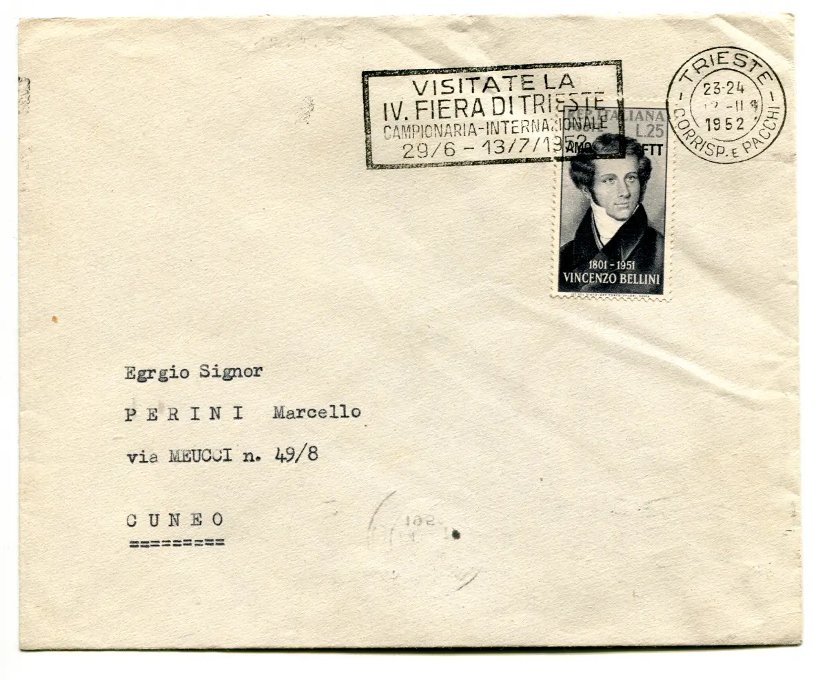 Triest A - Bellini isoliert auf Umschlag - Triest A - Bellini Nr. 140 isoliert auf Reiseumschlag nach Cuneo - Seltene einmalige Verwendung im Tarif Cod.1467/WEB