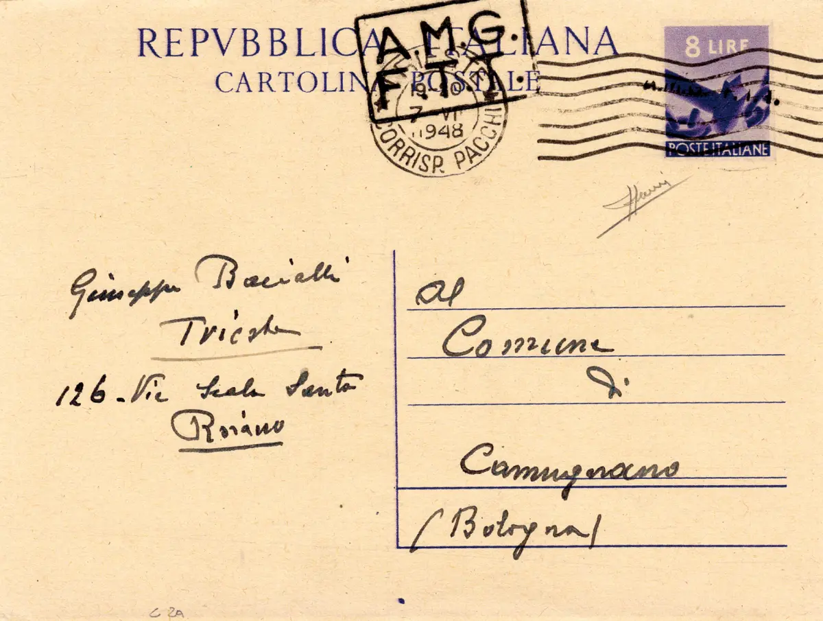Postkarte - Triest A - C.P. Lire 8 Democratica Handaufdruck Typ A+B (Nr. C 2A) reiste am 7.6.48 nach Camugnano - wertvolle nicht philatelistische Postnutzung - Sorani Cod. 1144/17