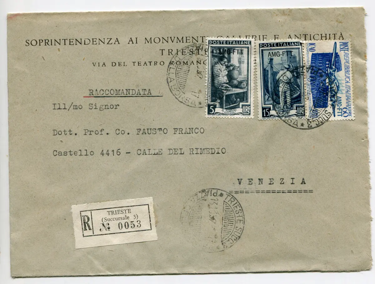 Umschlag - Icao Nr. 155 + Ergänzungen Nr. 92 + 96 auf Umschlag Racc. von Triest nach Venedig am 13.11.52 - Ungewöhnlich, im Tarif - Kat. € 140 Cod. 1028/14
