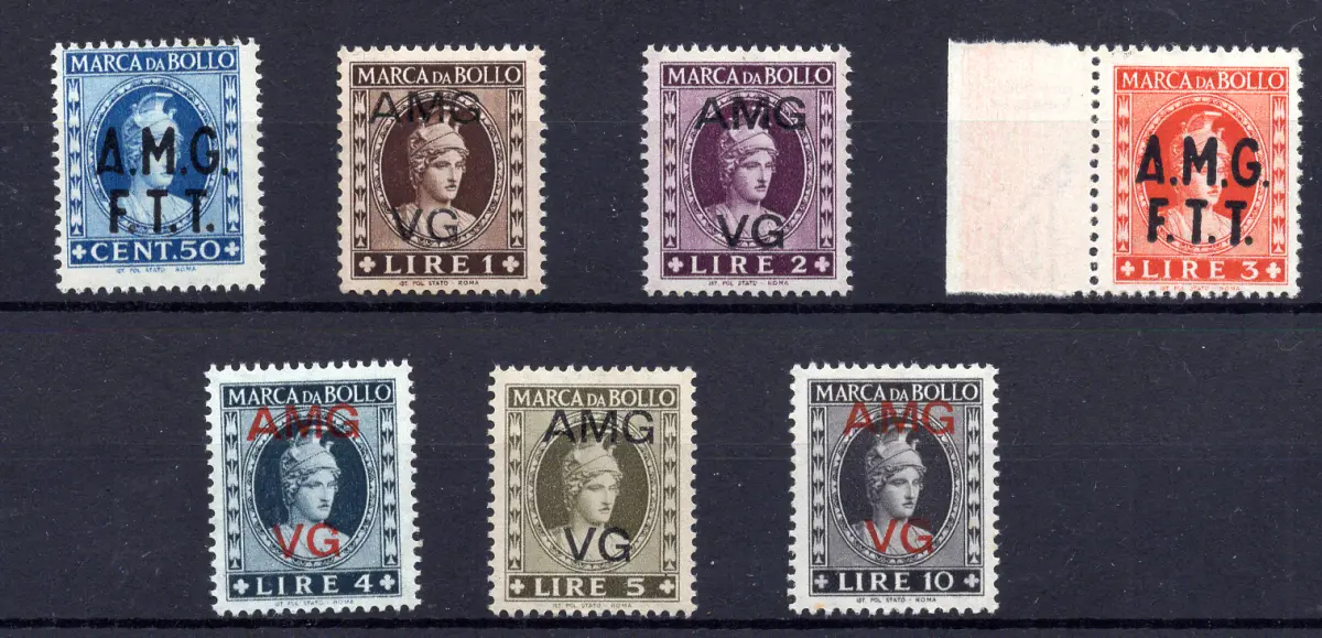 Triest mit Briefmarken - Lot von sieben Marken Minerva Vollgummi - MHN - - Briefmarken - Lot von sieben verschiedenen Minerva-Stempelmarken für die Gebiete von Triest; Fünf Werte von AMG aufgedruckt. Sehr guter Zustand. (Lire 1, 2, 4, 5 und 10) * Cent. 50 und 3 Lire AMG aufgedruckt. FTT Cod. 1038/14