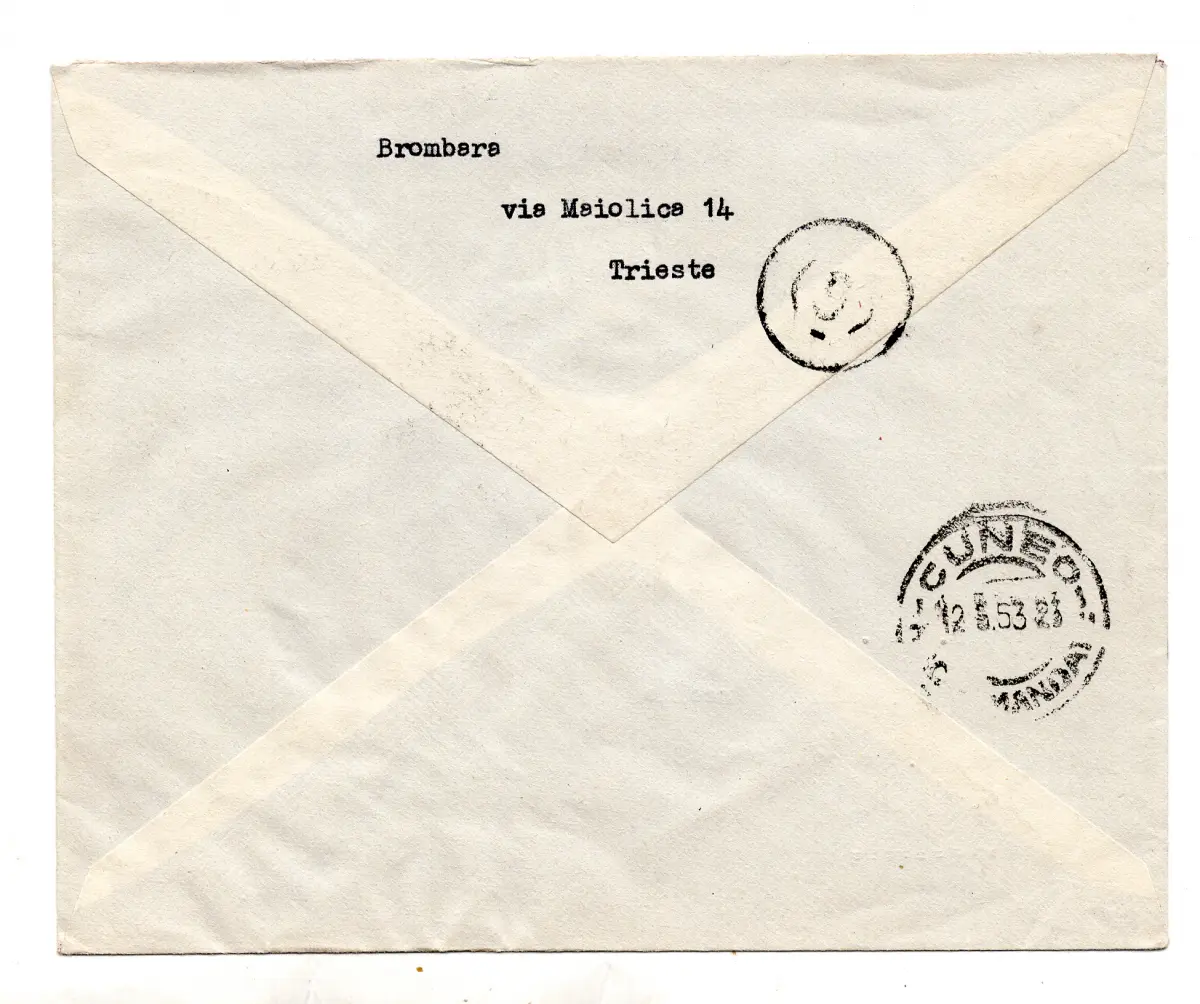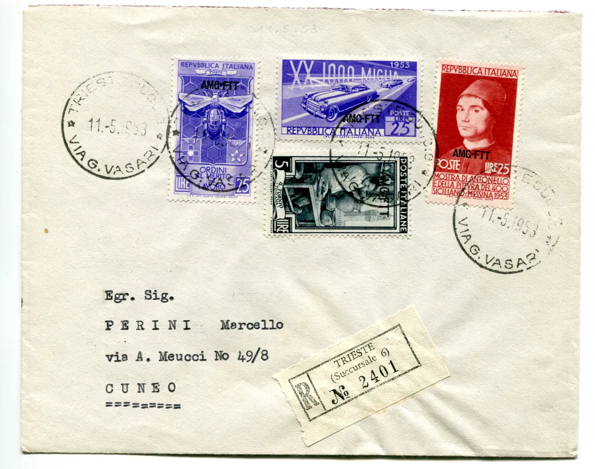Umschlag - Triest A - Mille Miglia Nr. 165 + Ergänzungen Nr. 92 + 164 + 166 auf Umschlag Racc. für Cuneo am 11.5.53 - Zwillingswerte im Tarif Cod.1499/WEB