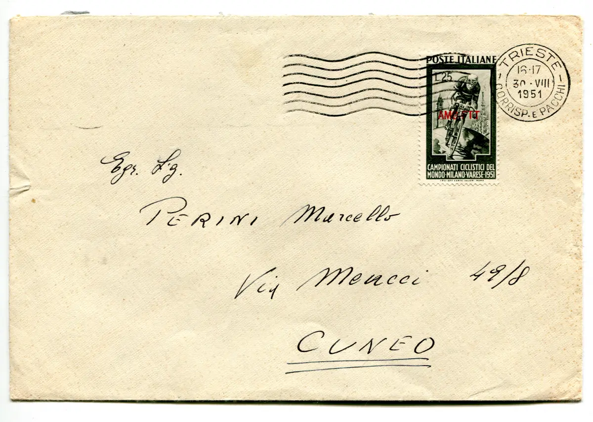 Triest A - Radsport 1951 isoliert auf Umschlag - Triest A - Radsport 1951 Nr. 127 isoliert auf Reiseumschlag nach Cuneo - Seltene einmalige Verwendung im Tarif Cod.1470/WEB
