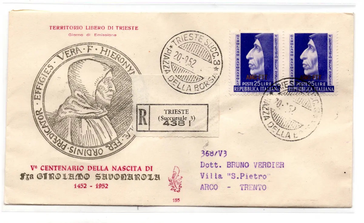 Umschlag - Savonarola Nr. 154 Paar auf Umschlag Racc. mit Ankunftsstornierung Cod. 577/17