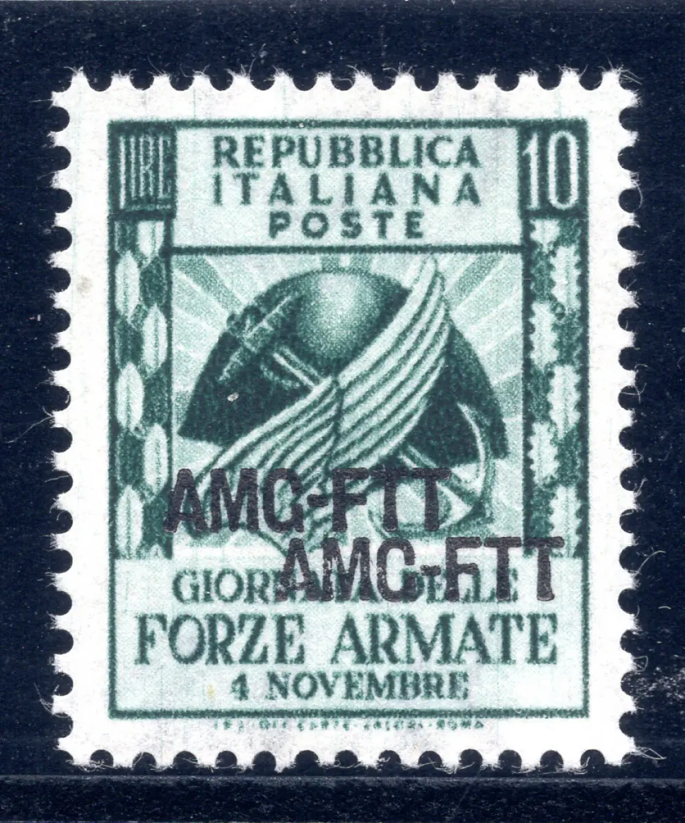 Triest A - Streitkräfte Lire 10 Sorten Doppelaufdruck Vollgummi MNH - Triest A - Streitkräfte Lire 10 Nr. 157b Doppelaufdruck - sehr gutes frisches und gut zentriertes Exemplar - Cert. D. Carraro Cod. 95/12
