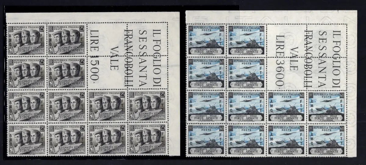 MNH - Vollgummi - Triest A - Streitkräfte Lire 25 und 60 Nr. 158/159 zwei Werte in Eckblöcken von zwölf Exemplaren (Kat. Collit. n. 19/20) neuer perfekter Vollgummi - Kat. euro 180 Cod. 3173/WEB