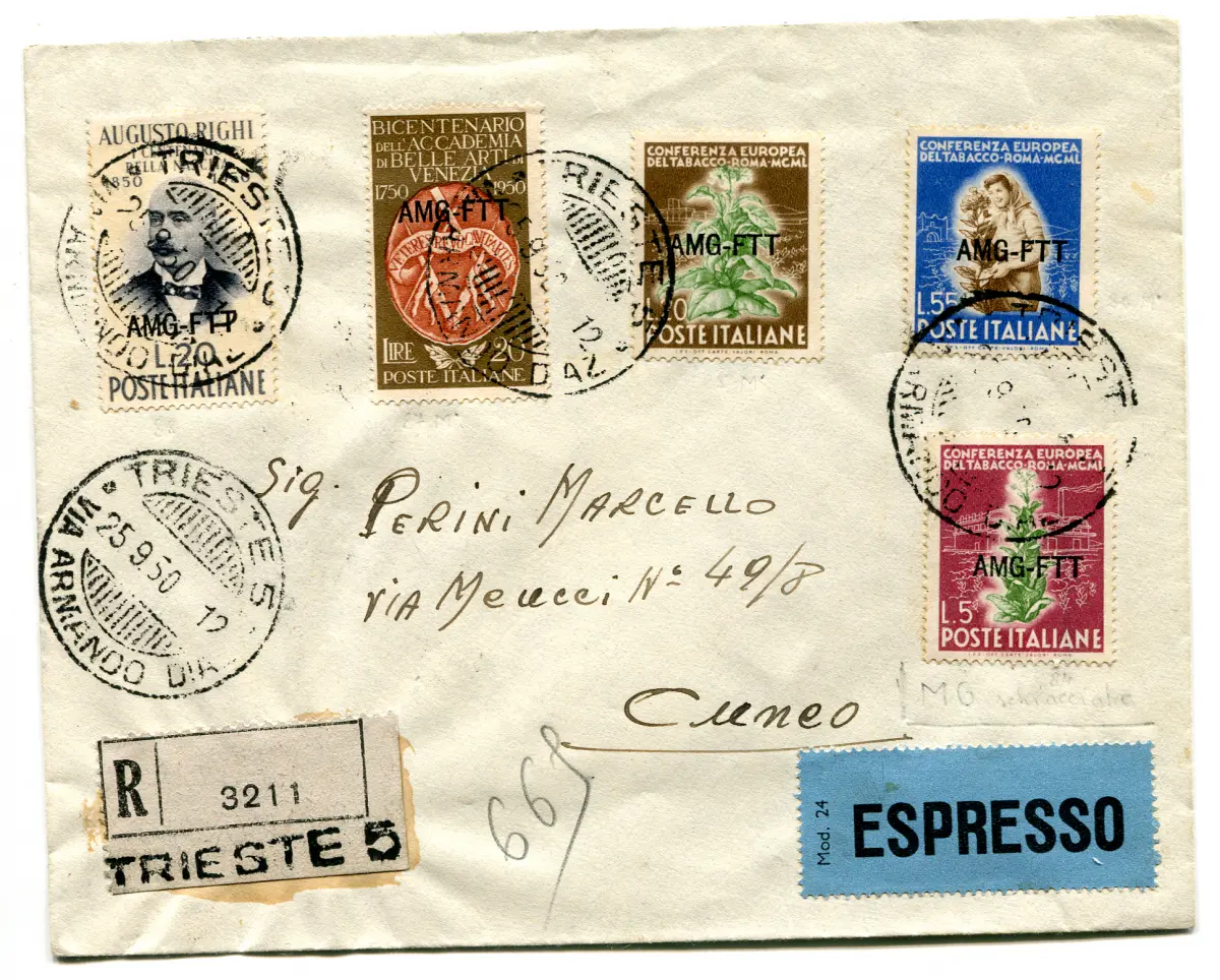Triest A - Tabak auf Umschlag Racc. espresso Umschlag - Trieste A - Tabak Nr. 84/86 Serie + Ergänzungen Nr. 87 + 88 auf Umschlag Racc. ausgedrückt am 25.9.50 - Schöner und ungewöhnlicher Euro-Katalog Cod.1486/WEB