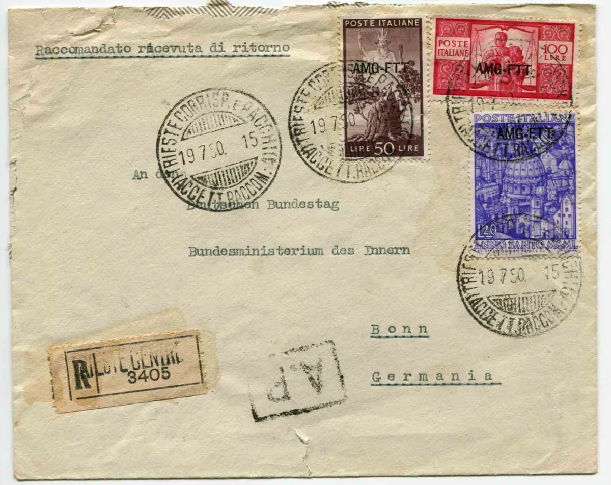 Triest Democratica Lire 100 auf Umschlag Racc. für Deutschland Umschlag - Demokratische Lire 100 Nr. 67 + Ergänzungen Nr. 66 + 73 auf Umschlag Racc. für Deutschland am 19.7.50 - Die 50 Lire Briefmarke weist einen Defekt auf - im Tarif - Ungewöhnlich 100 Lire Frankaturen mit Gedenkmünze Code Nr. 621/4