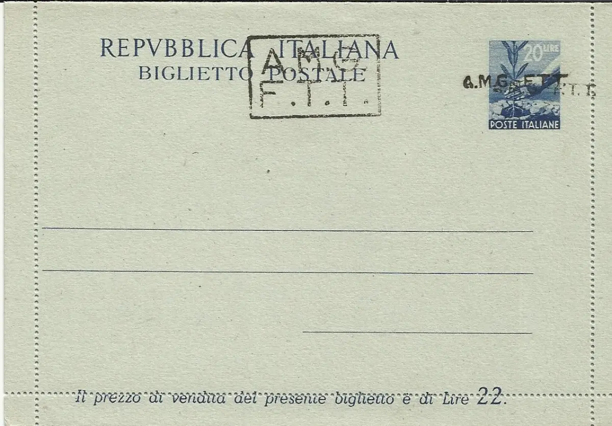 Triest A - B.P. Lire 20 Democratica Nr. B 2A (sz. A+B) Sorte Doppelaufdruck A Postkarte - Triest A - B.P. Lire 20 Democratica Nr. B 2A (sz. A+B) Doppelsorte Aufdruck A - Neu einwandfrei - Kat. 260 Code Nr. 868/4