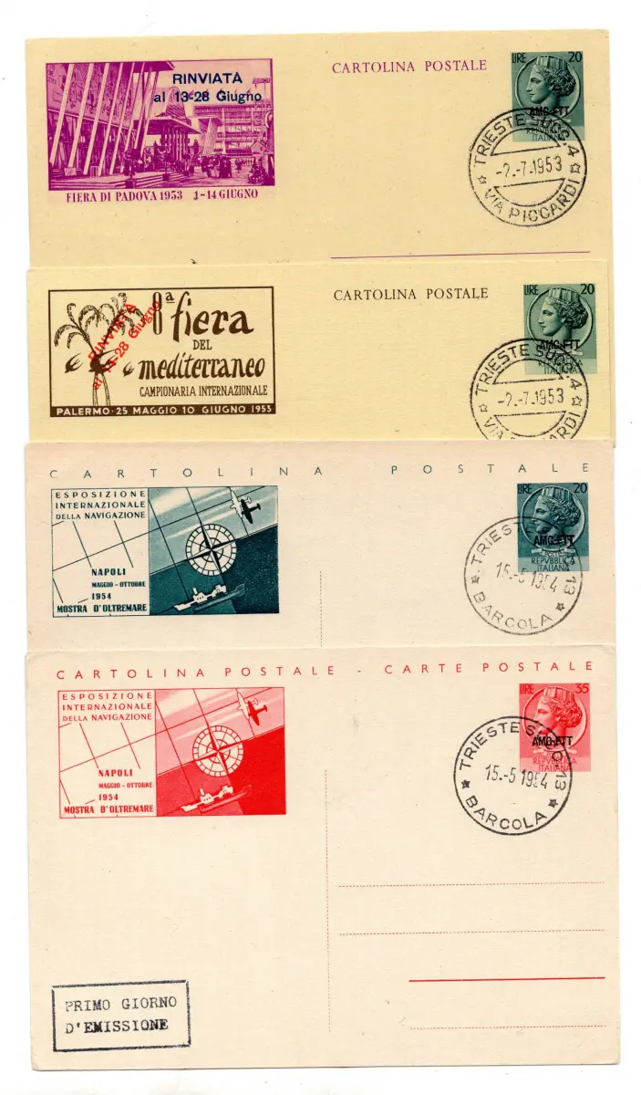 Triest A - C.P. Fiera d'Italia e Mostra d'Oltremare n. C24/C30 annulliert I. Ausgabetag - Triest A - C.P. Fiera d'Italia e Mostra d'Oltremare n. C24/C30 die sieben in 53/54 ausgegebenen Postkarten annulliert I. Ausgabetag, reisen Sie nicht - Schönes Ensemble - Kat. euro 100 n. 1384/20