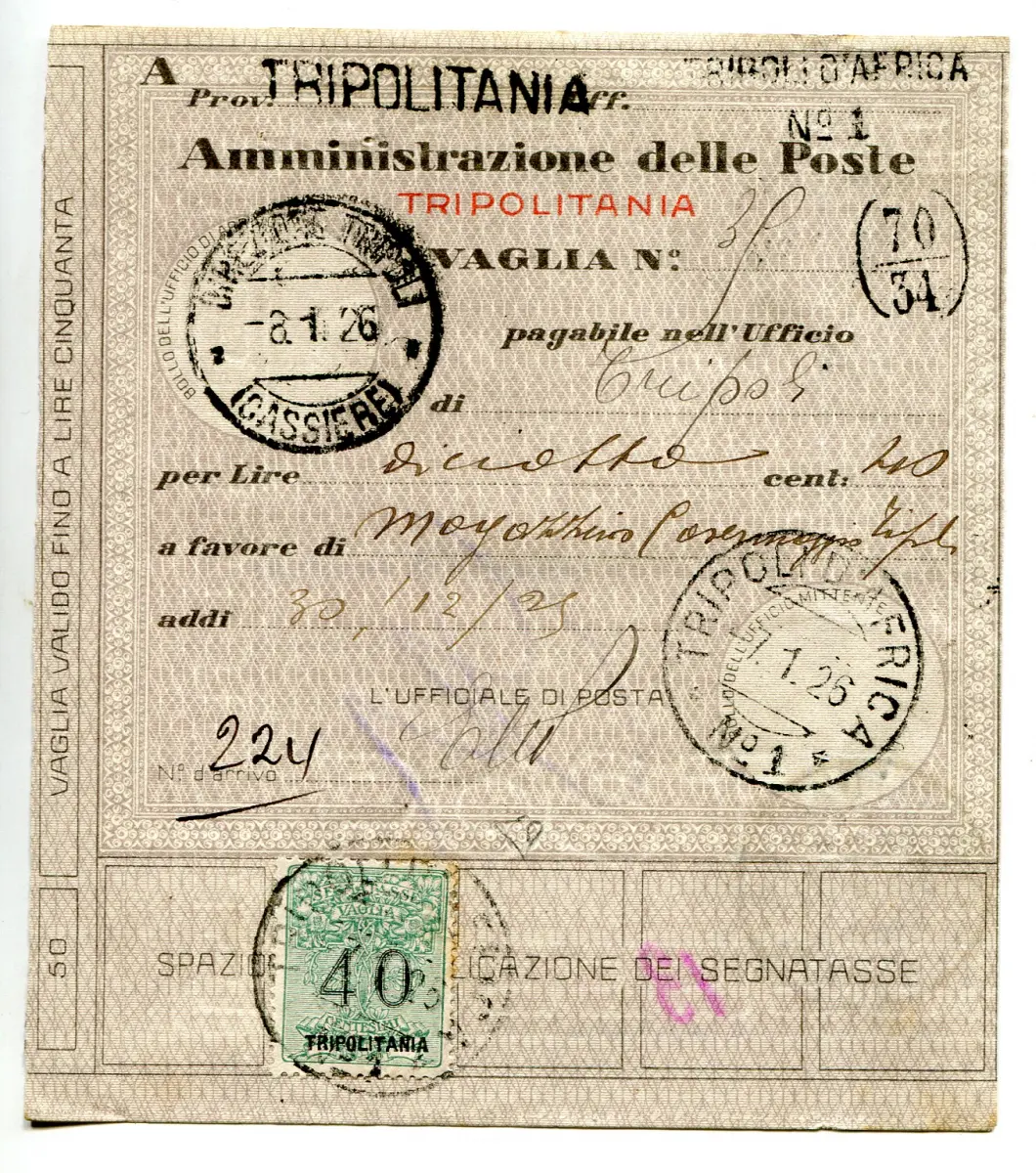 - Tripolitanien - Steuermarken Vaglia Cent. 40 Nr. 2 isoliert auf Siegelzettel Annullierung Tripolis von Afrika Nr. 1 vom 7.1.26 - sehr guter Erhaltungszustand - ED - Kat. 500 n. 1036/L