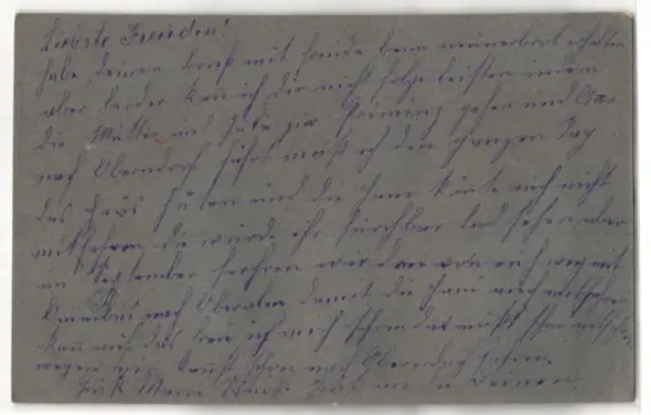 Personenbezogene Daten auf der Rückseite der Karte wurden durch blauen Textmarker unkenntlich gemacht. Die blauen Stellen sind auf die Vorderseite durchgeweicht und wirken sich negativ auf das Postkartenfoto aus