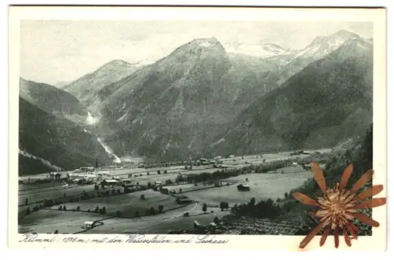 Trockenblumen-AK Krimml, Ortsansicht mit Wasserfällen und Seekaar, echte Trockenblume