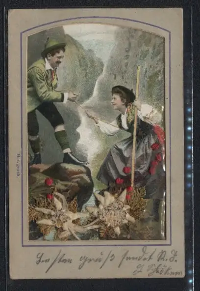 Trockenblumen-AK Pärchen in Tracht turtelt am Bach, echte getrocknete aufgeklebte Blume