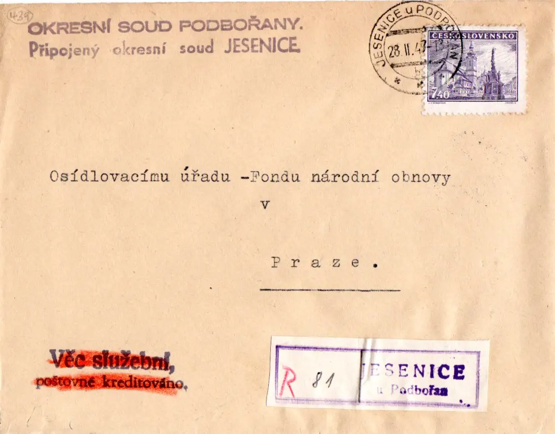 Tschechoslowakei 1947, 7,40 K. auf Einschreiben Brief m. Jesenice Not-R-Zettel