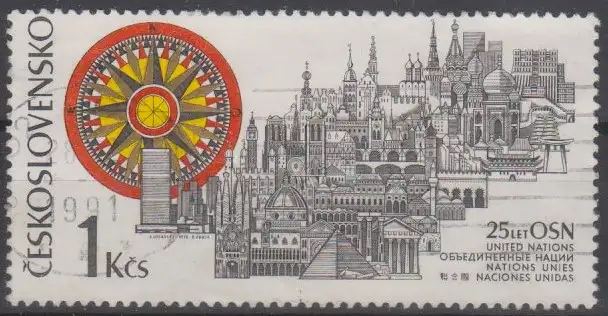 25 Jahre Vereinte Nationen (UNO): Markante Gebäude von Mitgliedstaaten der UN, Windrose