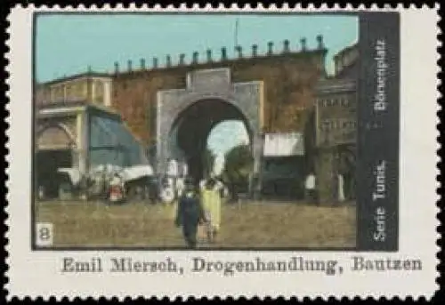 Börsenplatz, Serie: Tunesien, Größe/Zustand: 4x6 , guter Zustand, Original alte Reklamemarke die seinerzeit für die Werbung benutzt wurde