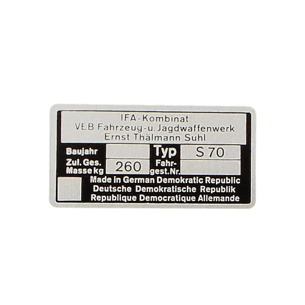 Typenschild Blanko geätzt für Simson S70 | Originalgetreues Ersatzteil