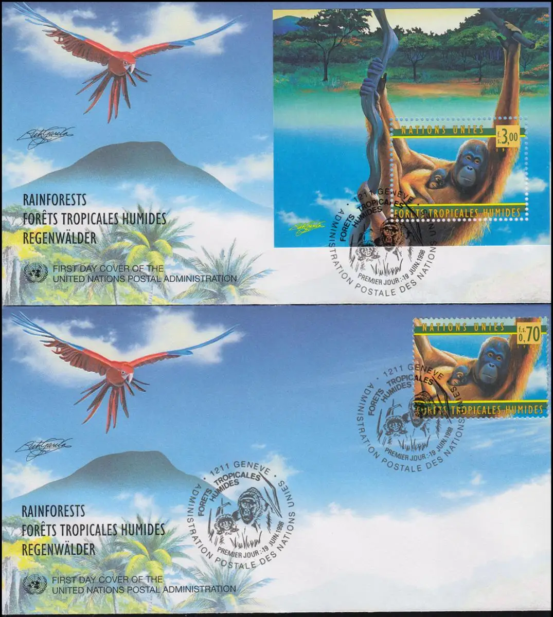 UNO Genf: 50 Jahre WHO Orang-Utan - Marke 346 und Block 10 auf 2 Schmuck-FDC