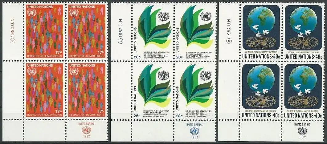 UNO NEW YORK 1982 Mi-Nr. 391/93 Eckrand-Viererblocks ** MNH