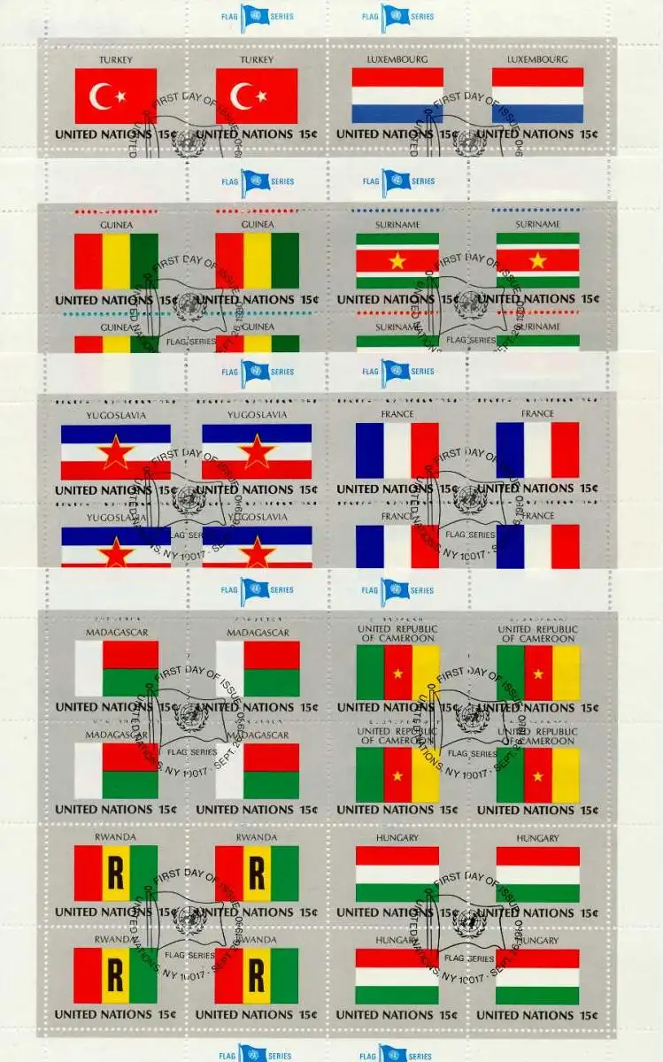 UNO Flaggenbogenausgabe des Jahres 1980 / 4 Kleinbogen, Ersttagssonderstempel