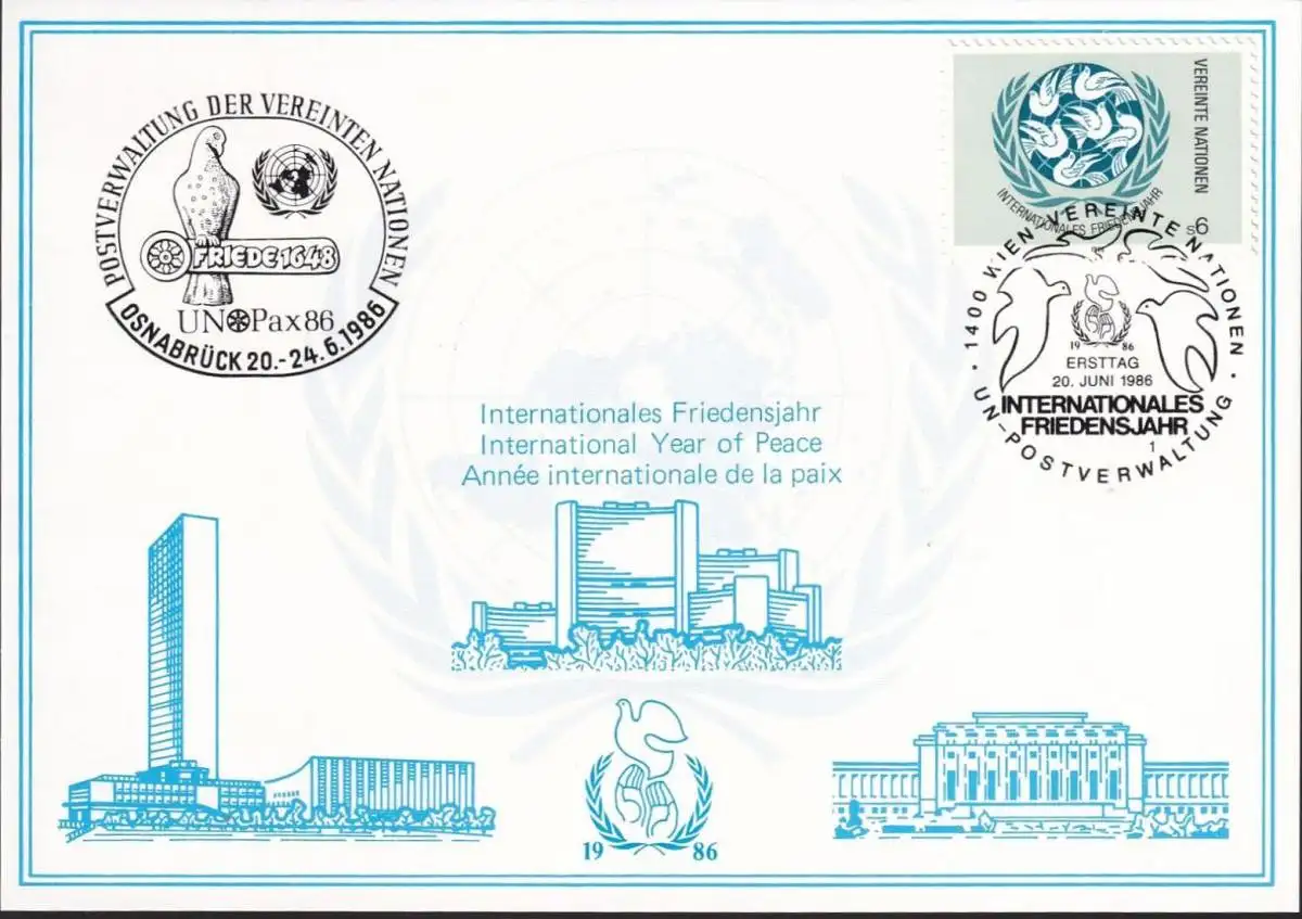 UNO WIEN 1986 Mi-Nr. 59 WEISSE KARTE - UNPAX 86 OSNABRÜCK 20.06.1986