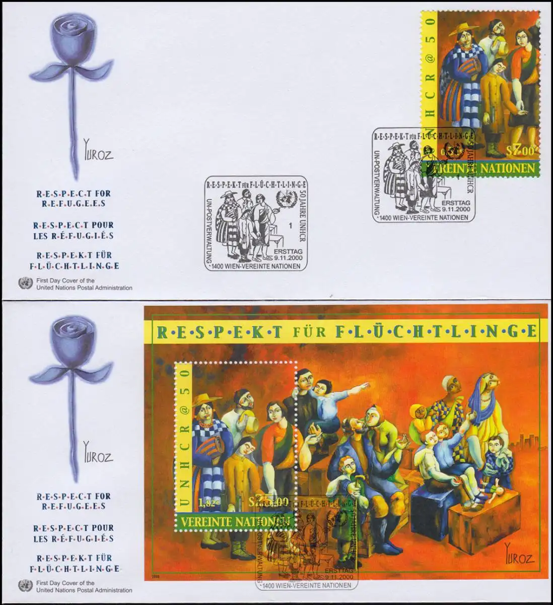 UNO Wien: UNHCR Flüchtlingshilfe 2000 - Marke und Block 14 auf 2 Schmuck-FDC