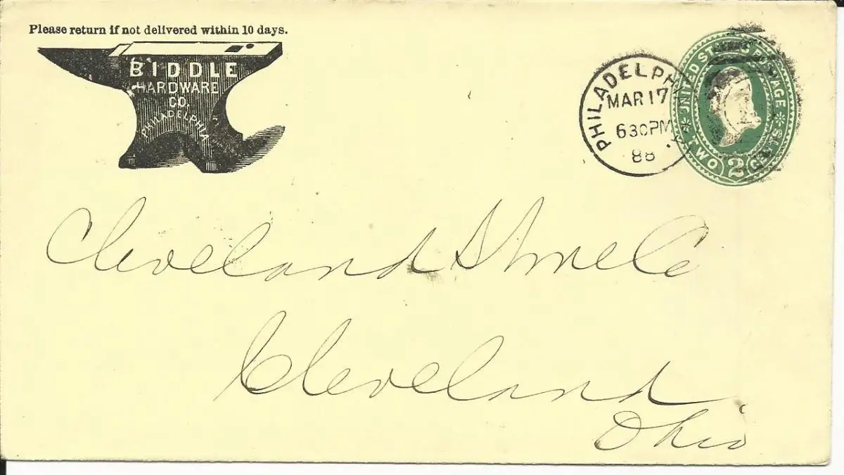 USA 1888, 2 C. Ganzsachen Umschlag v. Philadelphia m. Abbildung Amboss