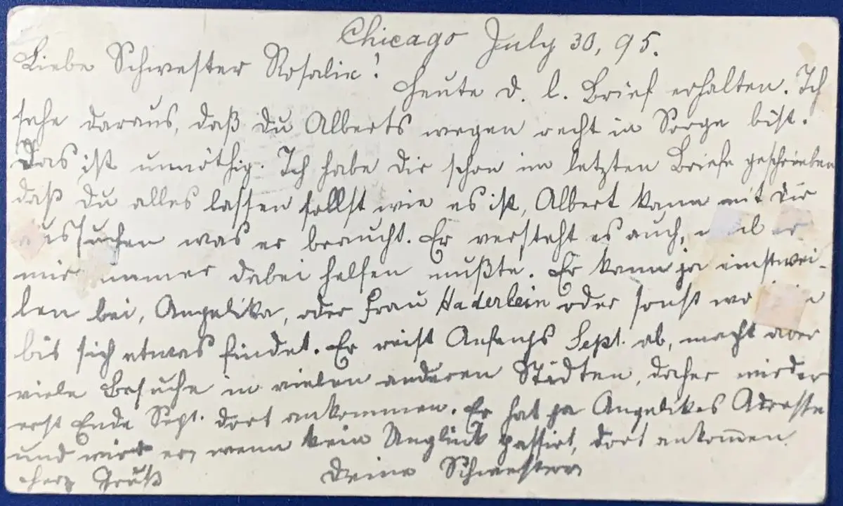 Postkarte (Ganzsache), gelaufen mit Poststempel vom 02.08.1895 von Chicago nach (Bad) Kissingen/Bayern. Kartenformat 130 x 77 mm, Karte hat Gebrauchsspuren, ansonsten gute Erhaltung.