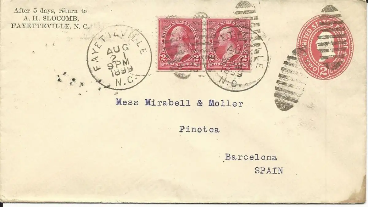 USA 1899, pair 2C. on 2 C. stationery envelope from FAYETTEVILLE N.C. to Spain.