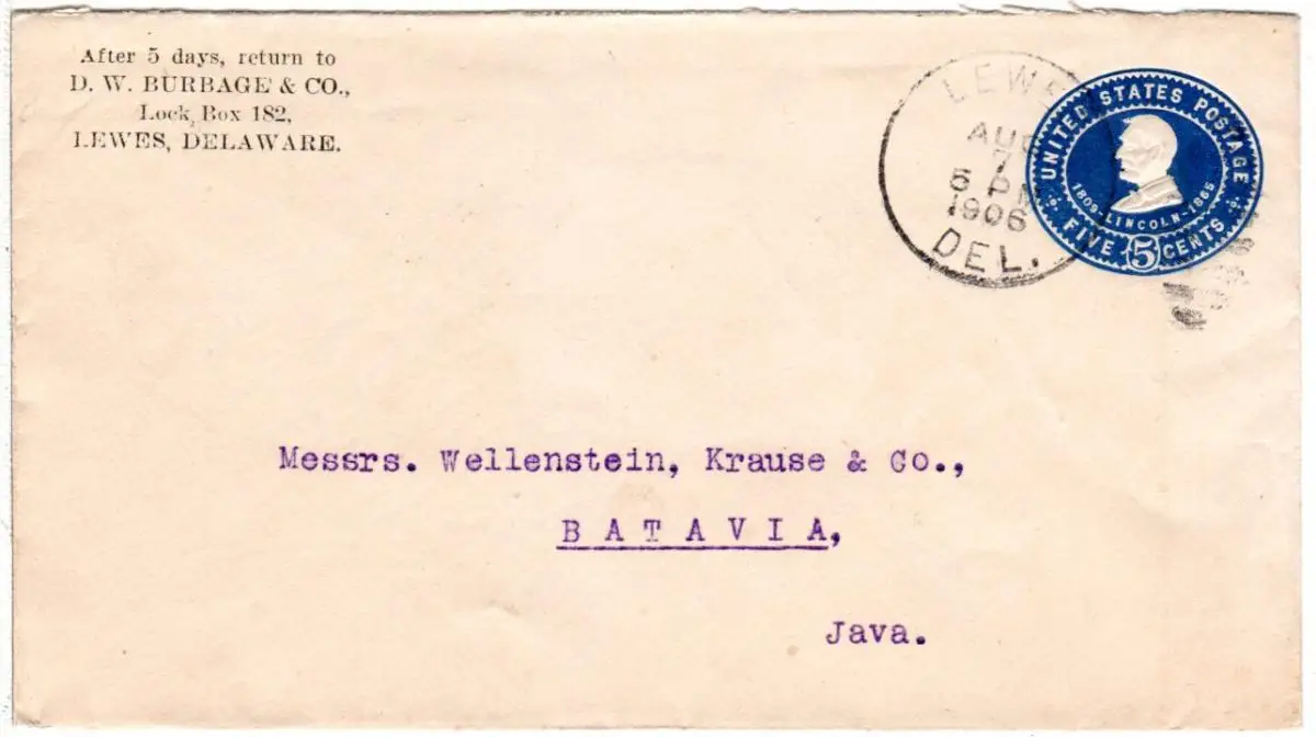 USA 1906, 5 C. Ganzsache Brief v. Lewes Delaware n. Java, NL Indien