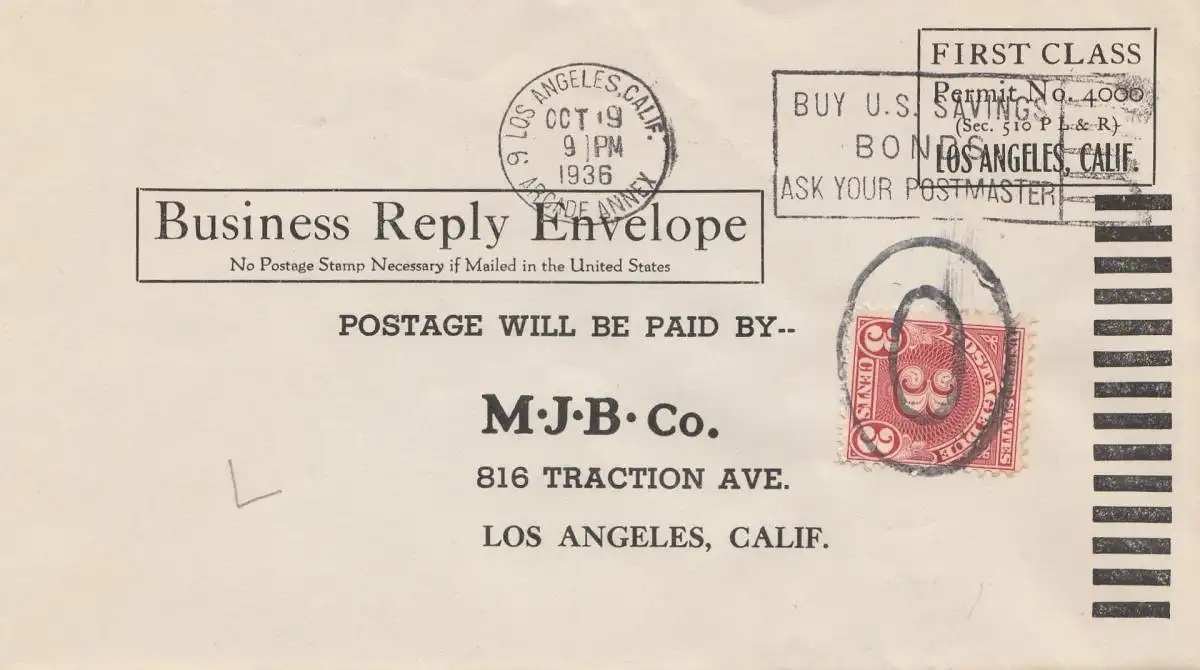 USA 1936: Los Angeles, Business Reply Envelope, First Class