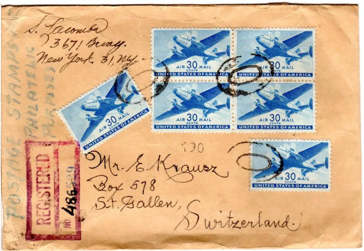 USA 1945, 10 Marken auf Einschreiben Brief v. NY i.d. Schweiz