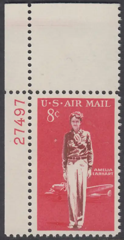 USA Michel 0845 / Scott C068 mit Falzrest LuPo-EINZELMARKE ECkRAND oben links m/Platten-# 27497 - Amelia Earhart, Fliegerin, Flugzeug Lockheed 10E Elektra