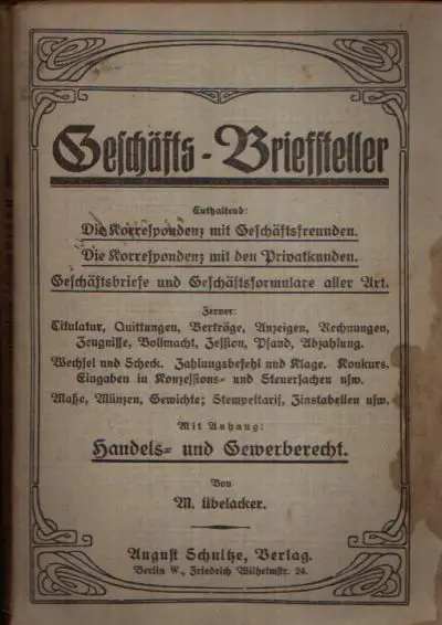Übelacker, M.; Geschäfts- Briefsteller; Mit Anhang: Handels- und Gewerberecht; Die Korrespondenz mit Geschäftsfreunden; Die Korrespondenz mit den Privatkunden; Geschäftsbriefe und Geschäftsformulare aller Art; Äußere und innere Form der Briefe; Titulaturen- Adressen; Rundschreiben ( Zirkulare); Preisanfragen, Offerten; Bestellungen; Begleitschreiben, Empfangsanzeigen; Reklamationen, Entschuldigungen; Mahnbriefe; Erkundigungsschreiben; Empfehlungsschreiben; Bittschreiben; Kündigungen; Rechnungen; Zeugnisse; Anzeigen- Annoncen; Quittungen- Vollmacht; Schuldscheine; Pfand-Bürgschaft; Zessionen; Verträge (Kontraste); Geschäftskauf; Sozietätsverträge; Abzahlung- Miete- Pacht; Eingaben in Gewerbeangelegenheiten; Das Gerichtswesen. Zahlungsbefehl und Klage- Verjährung; Konkurs; Vom Wechsel und Scheck; Münzen, Maße, Gewichte; Stempeltarife; Zinstabellen; Schriftlicher Verkehr mit der Post und Eisenbahn