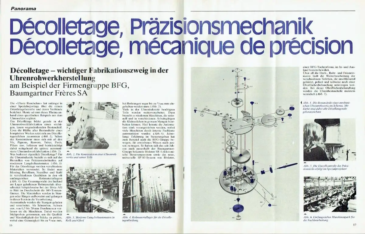 guter Zustand, Gebrauchs- und Alterungsspuren: Heft mittig senkrecht angeknickt - Seiten in der linken Hälfte am oberen Rand etwas wellig und teils schwach fleckig nach Feuchtigkeitseinfluss, Editorial - Irrtümer ... / Des erreurs ... - Economie / Wirtschaft - Les associations horlogères: Syndicat français des fabricants de montres - Wirtschaftsnachrichten / Nouvelles économiques - Report - Messespiegel/ Panorama des Foires - Panorama - Décolletage, Präzisionsmechanik / Décolletage, mécanique de précision - Décolletage — wichtiger Fabrikationszweig in der Uhrenrohwerkherstellung am Beispiel der Firmengruppe BFG, Baumgartner Frères SA - Produktebesprechungen / Présentations de produits - Technique / Technik - Technique de mesure, de contrôle et de régulation / Prüf-, Mess- und Regeltechnik, Kontrollapparate - FAETES / VESTAS - Nouvelles / Nachrichten - Handelsregister / Registre du commerce, Softcover, ca. 20,5 x 26,5, 30 Seiten mit zahlreichen Bildern
