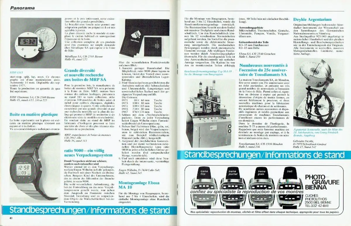 guter Zustand, Gebrauchs- und Alterungsspuren: die ersten 7 Blatt in der linken Hälfte am oberen Rand etwas wellig nach Feuchtigkeitseinfluss, Editorial - Bâle confirmera / Bestätigung in Basel - Economie / Wirtschaft - Notre portrait d'entreprise: Reymond & Co. SA, 1522 Lucens - Wirtschaftsnachrichten / Nouvelles économiques - Report - Messespiegel / Panorama des Foires - Panorama - Schweiz —Amerika - Zweikampf in der Uhrentechnik - Basler Messe 77 / La Foire de Bâle - Tabelle 3: Solid-state-Uhrentechnik im Steckbriefvergleich / Tableau 3: Modules solid state dans l'électronique horlogère - Standbesprechungen / formations de stand - Technique / Technik - Famille de chronographes AL 7750 - Betalights — auch nachts ohne Knopfdruck - Kooperationsvertrag BBC — Ebauches AG - Nouvelles / Nachrichten - FAETES / VESTAS - Handelsregister / Registre du commerce, Softcover, ca. 20,5 x 26,5, 78 Seiten mit zahlreichen Bildern
