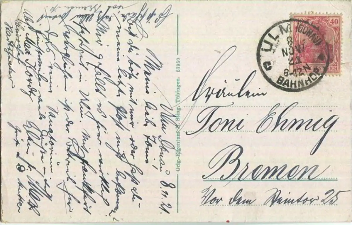 Ulm - Partie an der Läute - Stempel Ulm Bahnhof - Verlag H. Sting Tübingen - Gebrauchsspuren - Eckknick rechts unten (G2515) gel. 1921