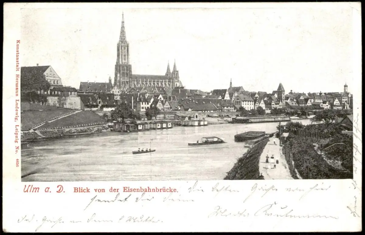 Ulm a. d. Donau Blick von der Eisenbahnbrücke, Flussbadeanstalt 1904