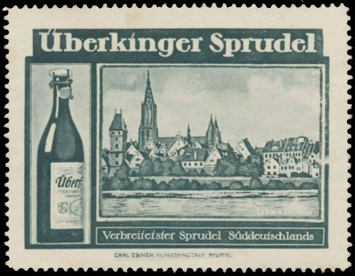 Überkinger Sprudel, verbreitester Sprudel Süddeutschland, Druck: Carl Ebner Kunstanstalt, Stuttgart, Größe/Zustand: 5x6 , guter Zustand, Original alte Reklamemarke die seinerzeit für die Werbung benutzt wurde