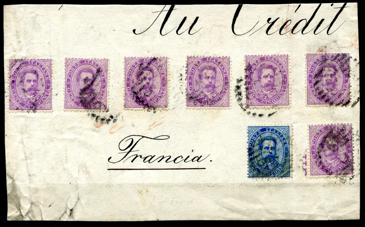 - Umberto I. Cent. 50 Nr. 42 sieben Exemplare + Ergänzung Nr. 40 auf großem Umschlagfragment - hochwertiger Mehrfachverwendung für Fachmann Nr. 40 41/A