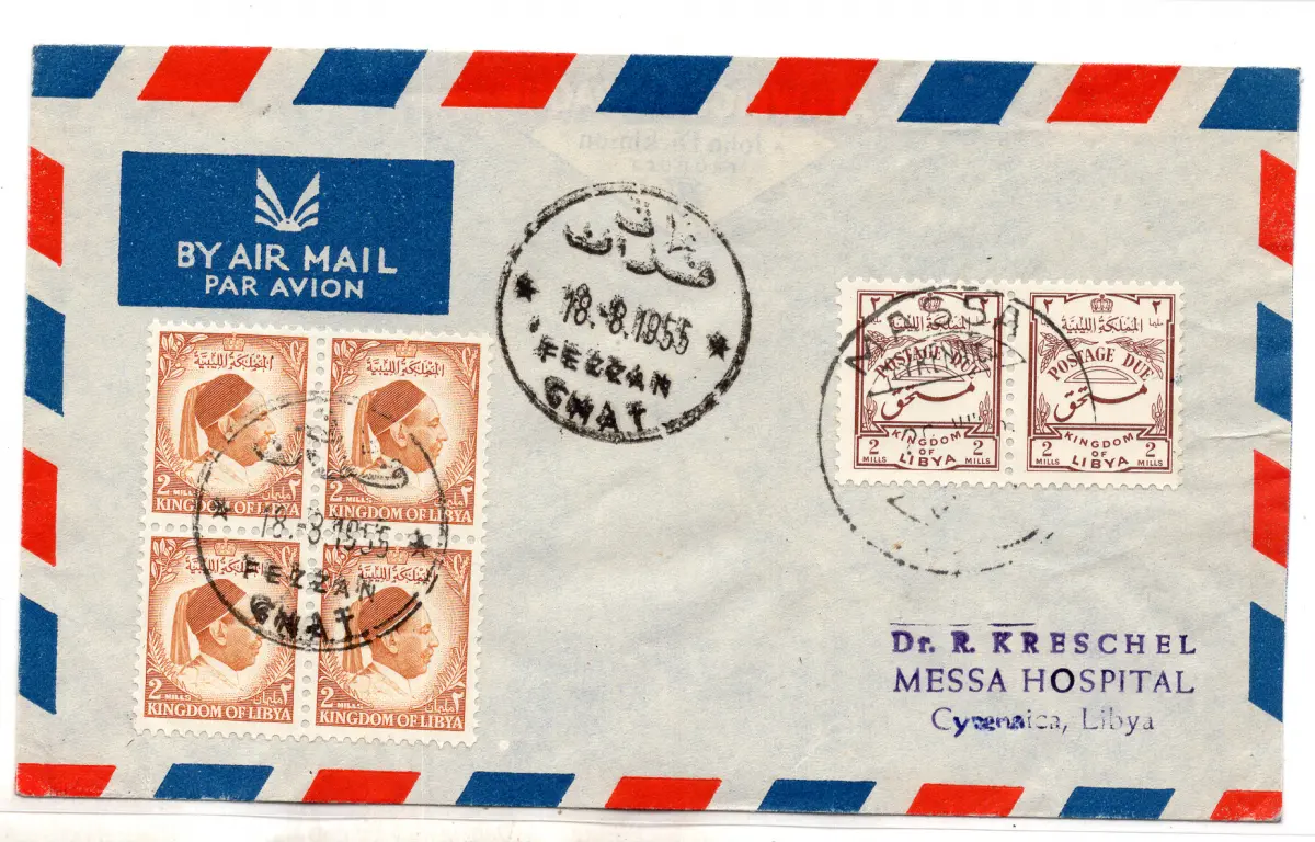Umschlag - - - Unabhängiges Libyen - König Idris 2 m. Ocker Nr. 34 Viertel auf Umschlag aus Ghat Fezzan am 18.8.55 für Steuermasse, die am 20.8.55 eintrifft, mit Steuermarkenpaar 2 m. Braun Nr. 1 - auf der Rückseite Ann. aus Bengasi - Ungewöhnlich, auch wenn als philatelistische Verwendung Cod. 2547/WEB