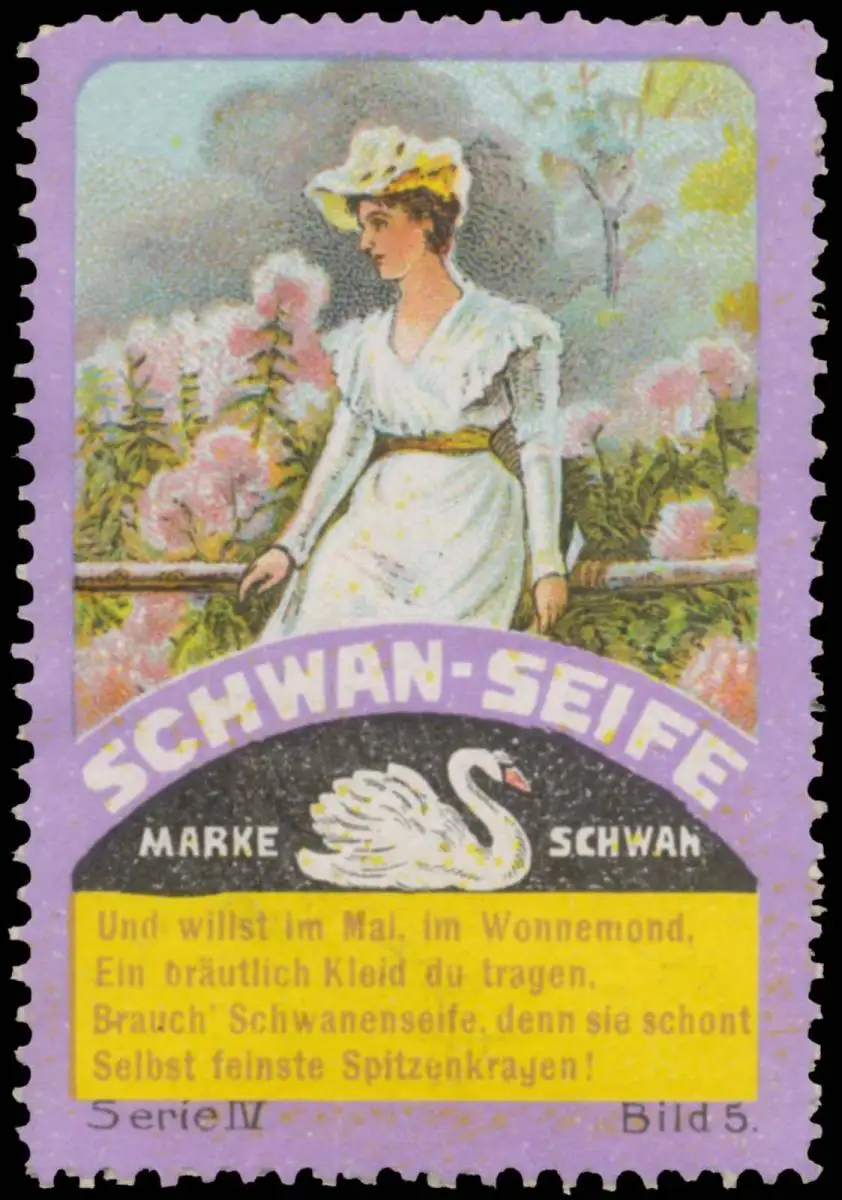 im Wonnemond, ein bräutlich Kleid du tragen. Brauch Schwanenseife, denn sie schont selbst feinste Spitzenkragen ! Serie IV, Bild : 5, Rückseite mit Reklame für das Seifix Sammelmarken - Album, Variante 2, Größe/Zustand: 5x4 , guter Zustand, Original alte Reklamemarke die seinerzeit für die Werbung benutzt wurde