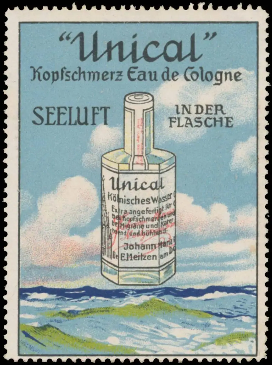 Kopfschmerz Eau de Cologne, Seeluft in der Flasche, Johann Maria Farina, Größe/Zustand: 4x7 , guter Zustand, Original alte Reklamemarke die seinerzeit für die Werbung benutzt wurde