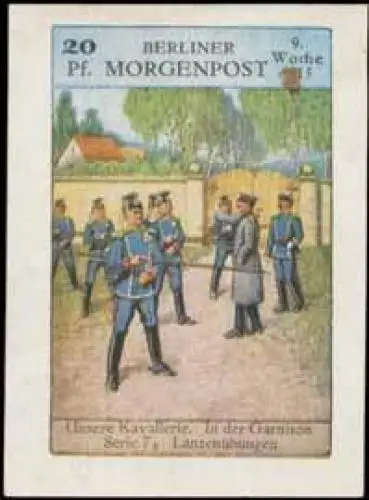 In der Garnison, Serie 7, Lanzenübungen, Quittungsmarke der Berliner Morgenpost, 9. Woche 1915, Rückseite beschriftet, Größe/Zustand: 8x6 , fleckig, Original alte Reklamemarke die seinerzeit für die Werbung benutzt wurde
