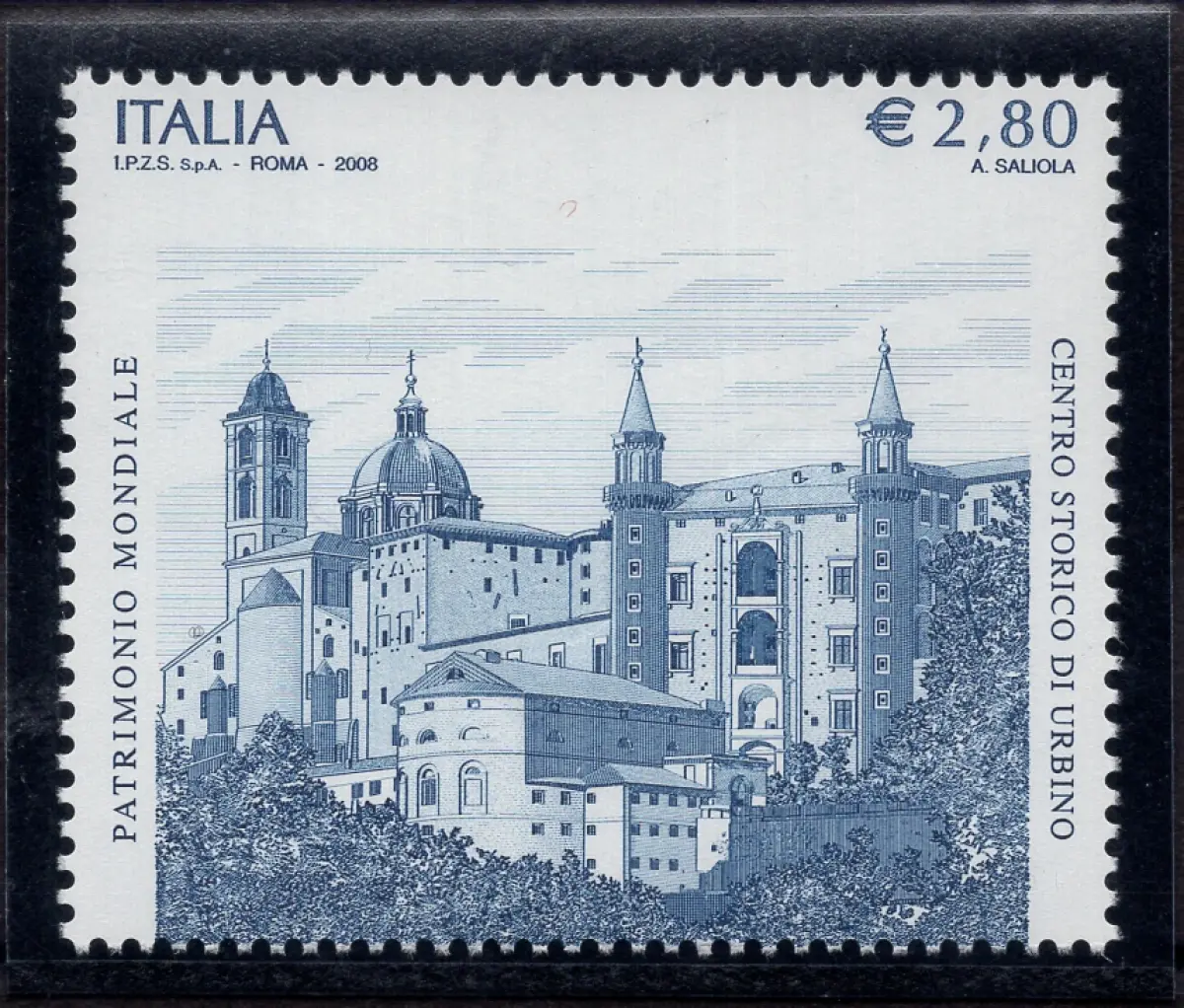 MNH - Vollgummi - Urbines Künstlerisches Erbe mit stark verschobener Verzahnung, so dass der Italien-Euro-Schriftzug 2,80 oben statt unten ist (Unified-Nr. 3117Da) neuer perfekter Vollgummi - Ungewöhnlich mit Verschiebung, die eine natürliche Briefmarke Cod. 3300 / WEB macht