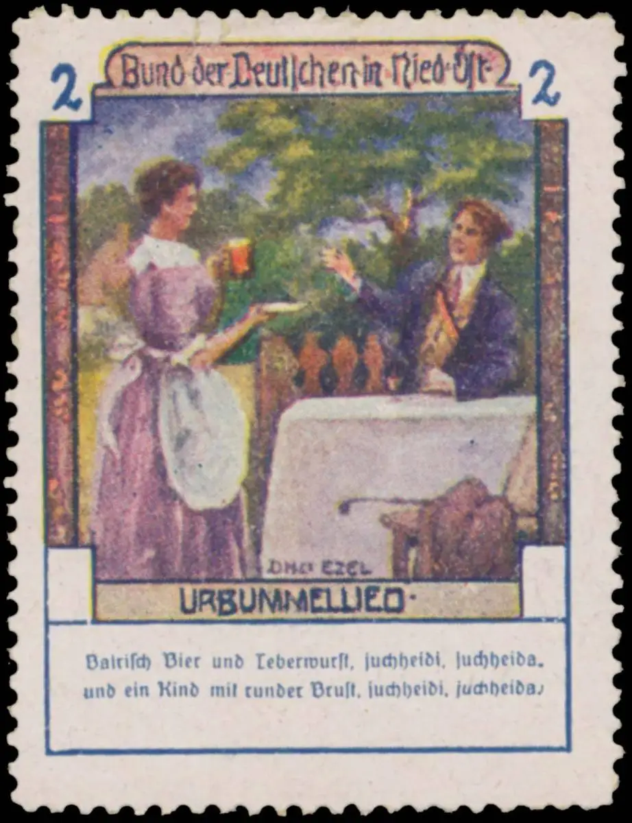 Bairisch Bier und Leberwurst, jucheidi, juchheida und ein Kind mit runder Brust, juchheidi, juchheida. Spendenmarke, Größe/Zustand: 5x4 , guter Zustand, Original alte Reklamemarke die seinerzeit für die Werbung benutzt wurde