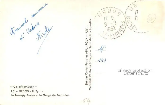Urdos Vall?e d`Aspe Urdos postalisch gelaufen 1952 Erhaltung siehe scans [LiesaD40] LiesID40
