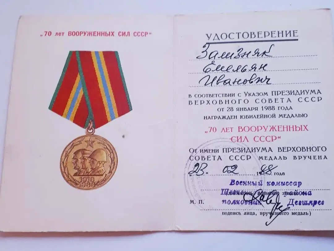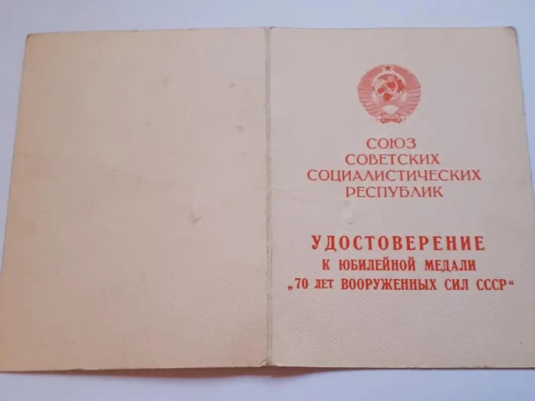 Urkunde zur Medaille 70.Jahre Streitkräfte der UDSSR