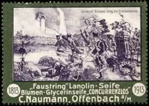 Faustring Lanolin-Seife, Blumen-Glycerinseife Concurrenzlos, Großbeeren, Befreiungskriege, Größe/Zustand: 5x6 , guter Zustand, Original alte Reklamemarke die seinerzeit für die Werbung benutzt wurde